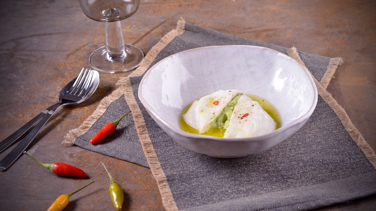 Mozzarella rellena de aguacate con ralladura de limón y anchoas