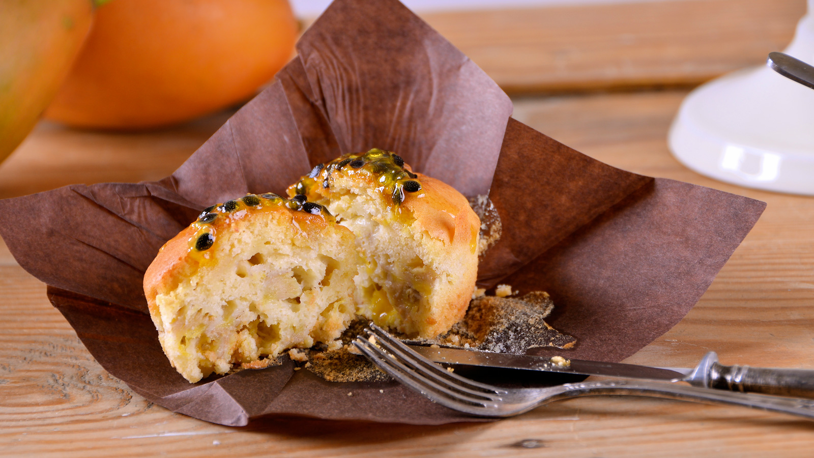 Rociamos los muffins con el sirope de fruta de la pasión y servimos.