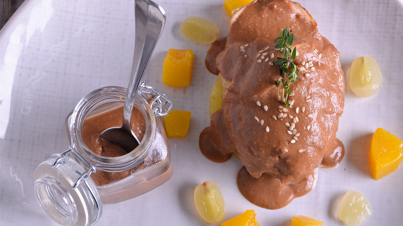 Muslos de pollo con salsa de chocolate y frutas