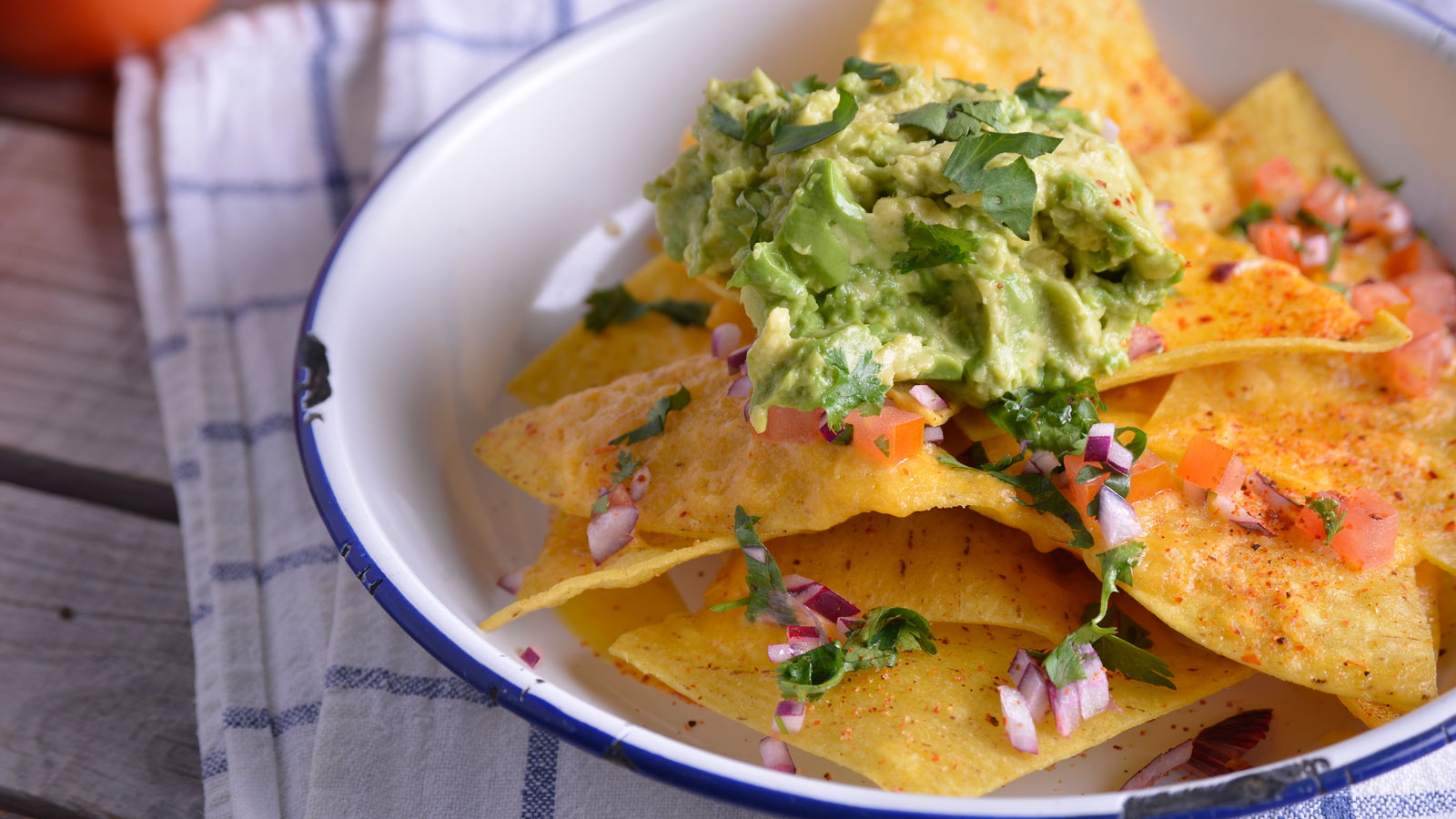 Emplatamos cubriendo el fondo del plato con la pasta de frijoles y añadimos por encima los nachos. Terminamos vertiendo el queso fundido por encima, el pico de gallo y, finalmente, en el centro, el guacamole.