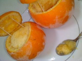 Echamos a la mescla de punto de nieve la segunda mescla de yemas y zumo, lo vamos removiendo para que se mescle completamente. El resultado será una espuma espesa esponjosa de un color rosado, entre blanco y naranja. Una vez lo tengamos solo nos queda rellenar las naranjas, con ayuda de una cuchara vamos rellenandolas poco a poco sin que gotee fuera para no ensuciarlas. Posiblemente nos sobre un poco de mescla, depende del tamaño de las naranjas. Una vez tengamos la mescla dentro de las naranjas, las tapamos con la tapita de naranja que cortamos al principio, y lo metemos en el congelador. Dejamos que pasen 9 horas y ya estara listo para servir. Curiosidad: Gracias a que la mescla esta esponjosa, no se congela formando hielo, sino que se crea un interior suave facil de romper con la cuchara. Esto se debe a las claras en punto de nieve, cuanto mejor hayamos hecho ese punto más esponjoso estara el interior de nuestro postre.