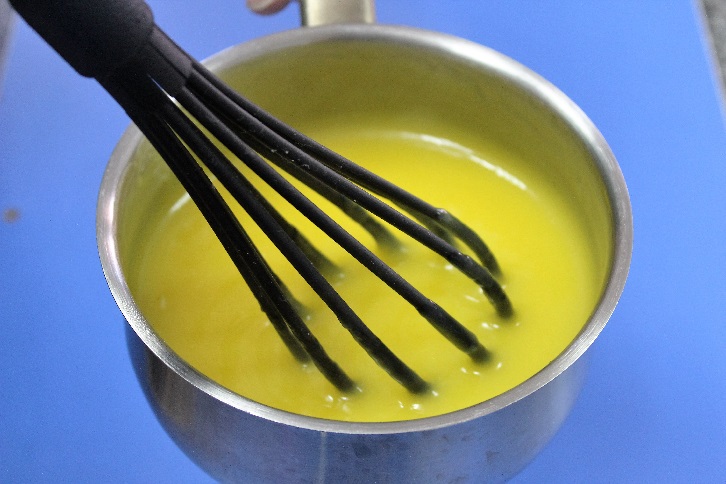 Cuando el zumo comience a hervir baja el fuego. Añade el agua y las yemas, remueve hasta que la mezcla espese y retírala del fuego.