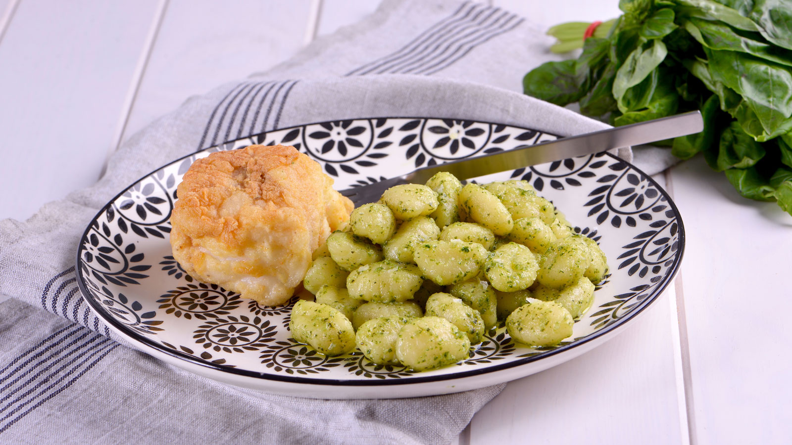 Ñoquis al pesto con cola de rape frita
