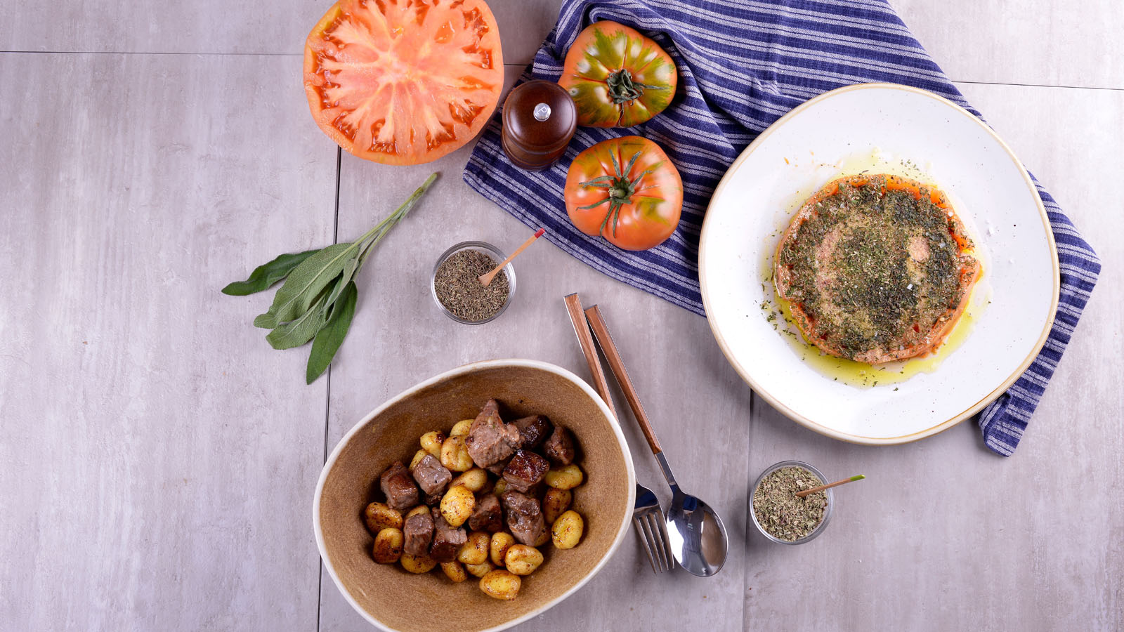 Ñoquis burro e salvia con dados de lomo bajo y tomates al horno