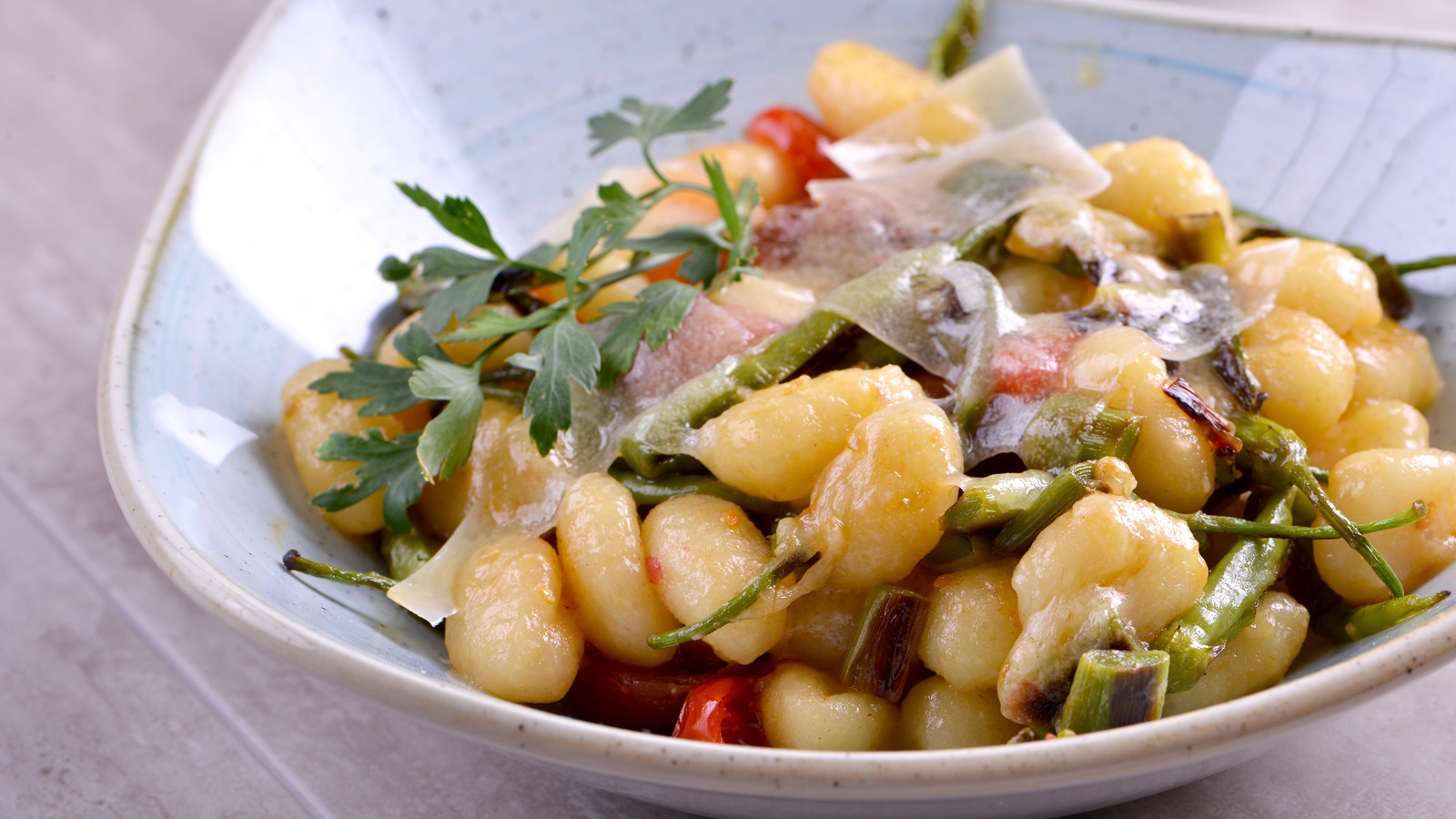 Cuando tomen color, vamos añadiendo los ñoquis con un poco de su agua de cocción y mantecamos hasta que estén suaves y brillantes.