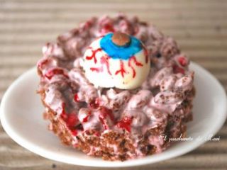 Cortamos las bolas de chocolate por la mitad con cuidado de no desmigarlas, si se agrietan un poco no pasa nada, más terroríficas, ponemos media bola sobre cada cuadradito, apretando un poquito para que queden pegadas.