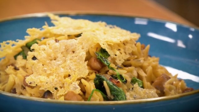 Orzo cremoso con setas, pollo y espinacas