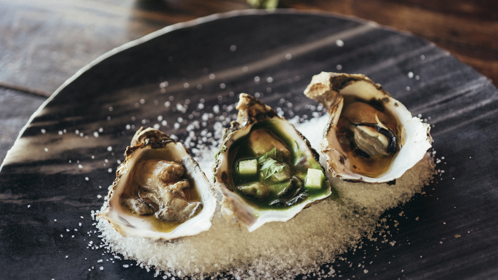 Servimos una cama de sal gorda colocamos la mitad de las ostras crudas en sus conchas y las aderezamos con la leche de tigre y un poco de manzana y apio picado.
