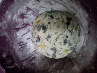 Añadimos el aceite, la cebolla en trocitos finos y las aceitunas picaditas, removemos y amasamos todo hasta formar una bola tapamos con film y dejamos doblar de volumen en una zona templada de la casa.