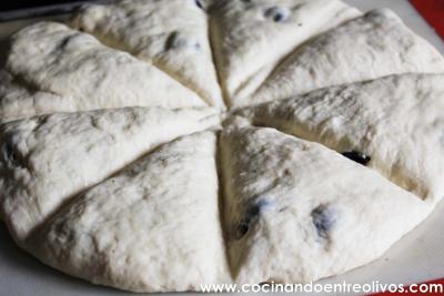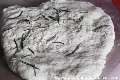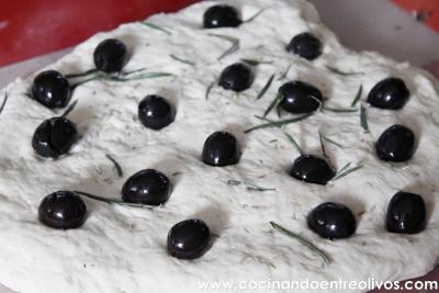 Ponemos el romero por encima y las aceitunas. Remetemos los bordes hacía dentro, cubriendo de masa todas las aceitunas.