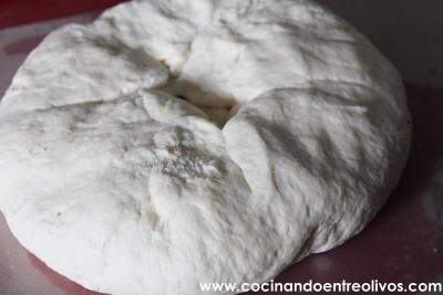 Ponemos la masa en la encimera, ligeramente enharinada, formamos una bola que aplanamos.