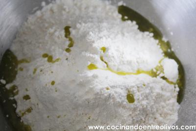 En el cuenco de la amasadora, o en un cuenco ponemos el harina, la sal, el aceite de oliva virgen extra y el agua. Mezclamos.