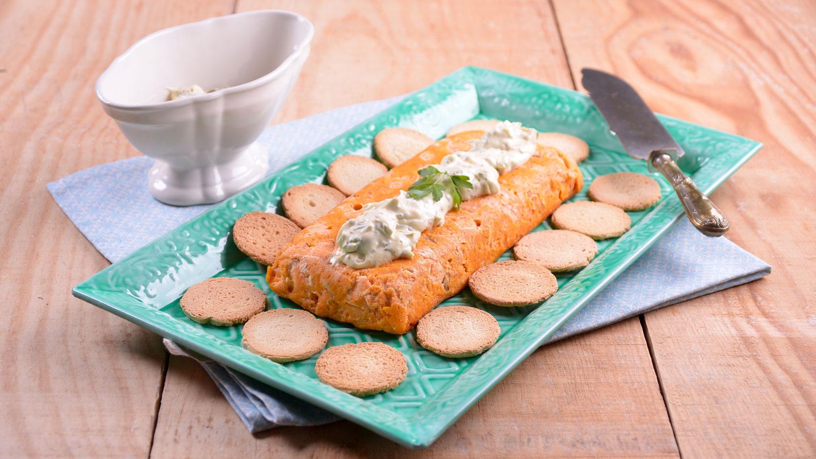 Emplatamos nuestro pan de salmón y servimos acompañado de la salsa tártara y unas tostas de pan.
