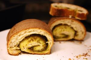 Se estira la masa con la ayuda de un rodillo y dentro se coloca en relleno (en este caso perejil, dos dientes de ajo, almendras, una pizca de sal y aceite de oliva virgen extra todo batido) , y se enrolla como si fuera una napolitana.