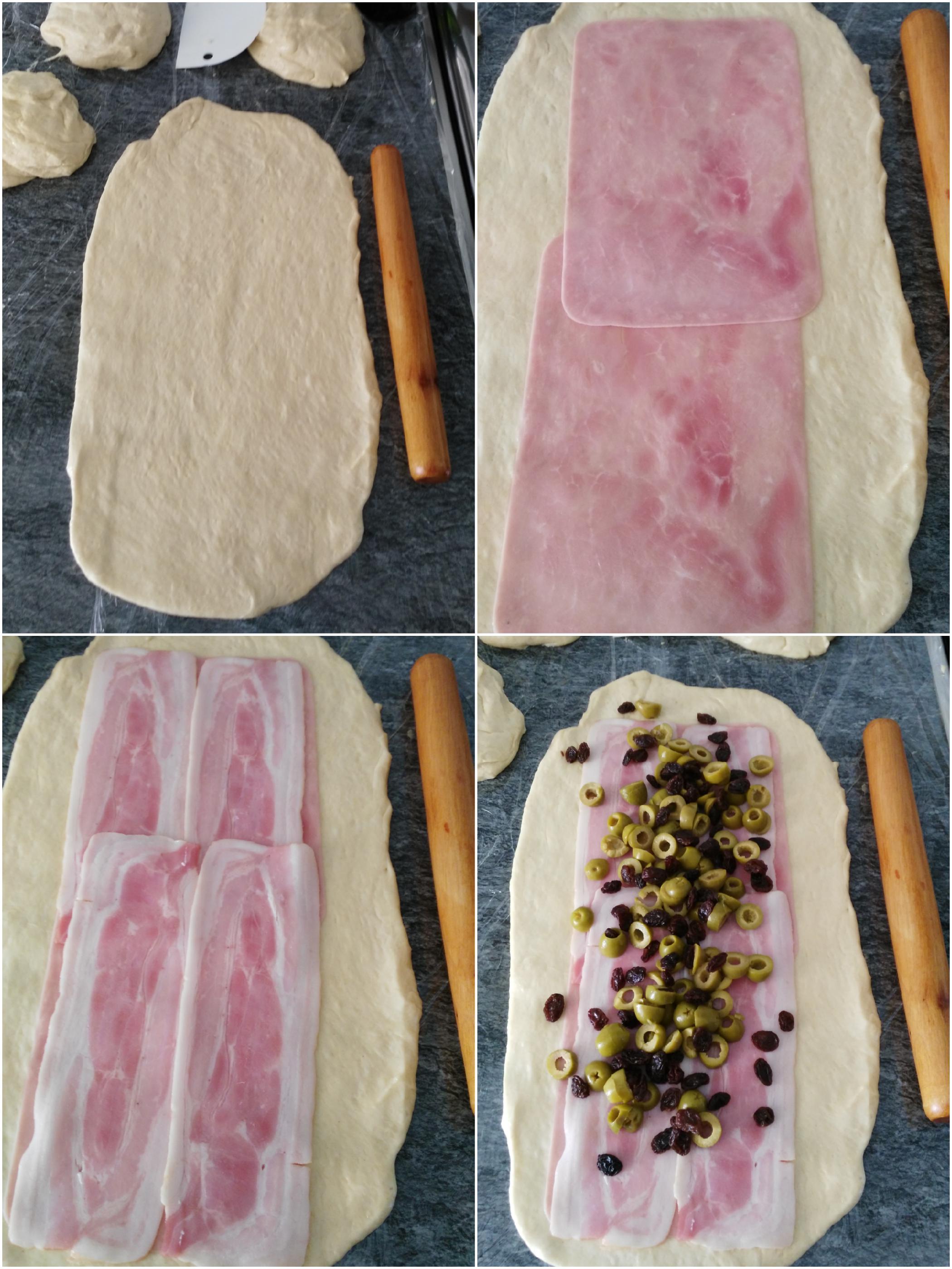 Reparte sobre la masa el jamón york, el bacon, las pasas y las aceitunas troceadas en ese orden