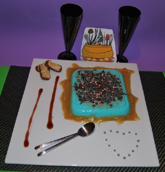 •Ponemos el azúcar, la leche y la nata en un cazo y le añadimos la vaina de vainilla abierta, raspando sus semillas y añadiendo todo, incluida la vaina. Empezamos a calentar removiendo para que se disuelva el azúcar y entonces le añadimos las hojas de gelatina bien escurridas, unas gotas de colorante alimentario azul y también el licor. Empezamos a remover con unas varillas hasta que la gelatina esté completamente disuelta. No hace falta que llegue a hervir. Dejamos 5 minutos quitamos la vaina de vainilla y lo colamos.
