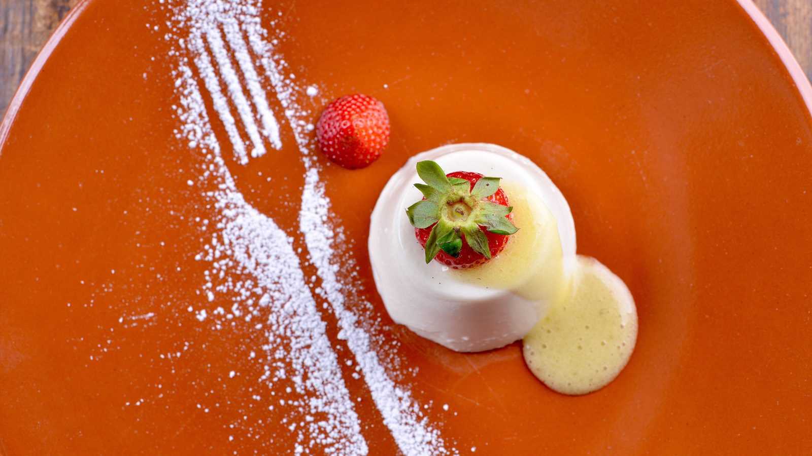 Servimos la panna cotta y acompañamos con los fresones y la crema de maracuyá. Decoramos con hierbabuena.