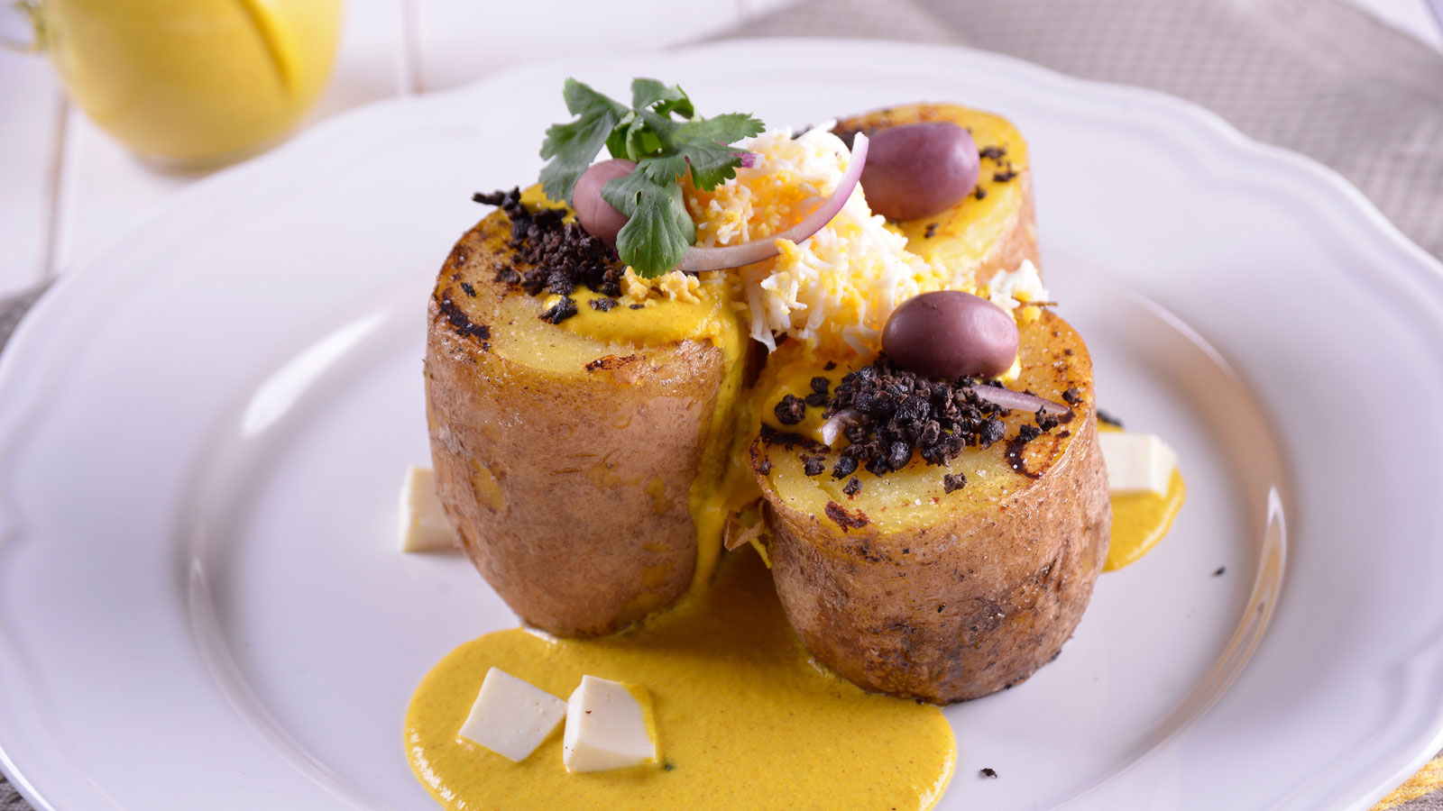 Emplatamos las patatas y las regamos con la salsa. Terminamos con los huevos, las aceitunas, el polvo de aceitunas y el perejil.