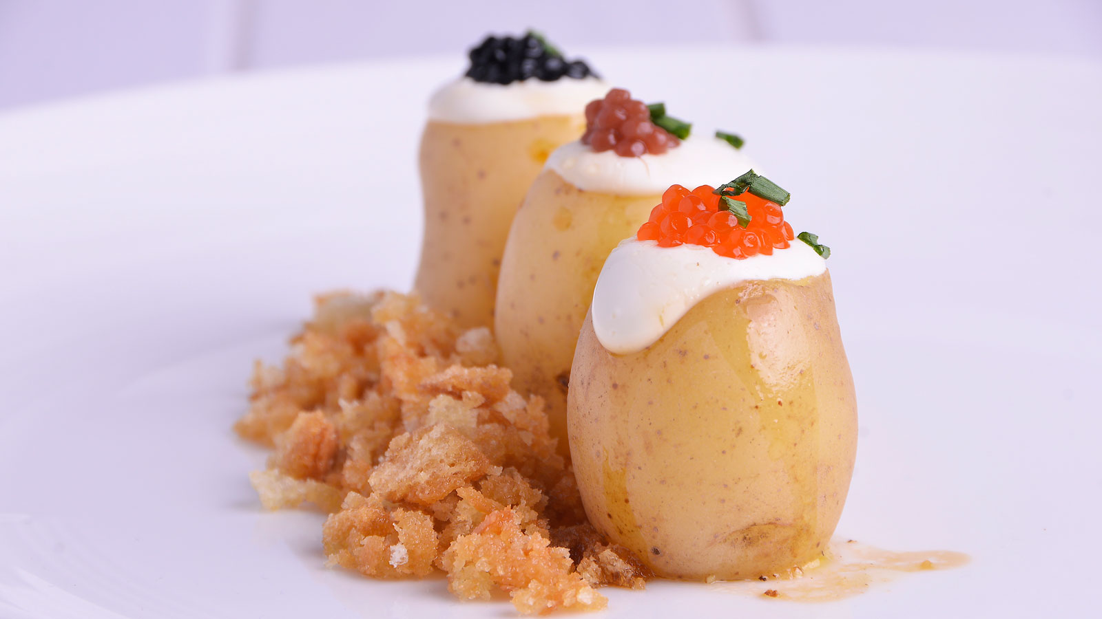 Con ayuda de una manga pastelera o una cuchara, ponemos queso crema sobre las patatas.
