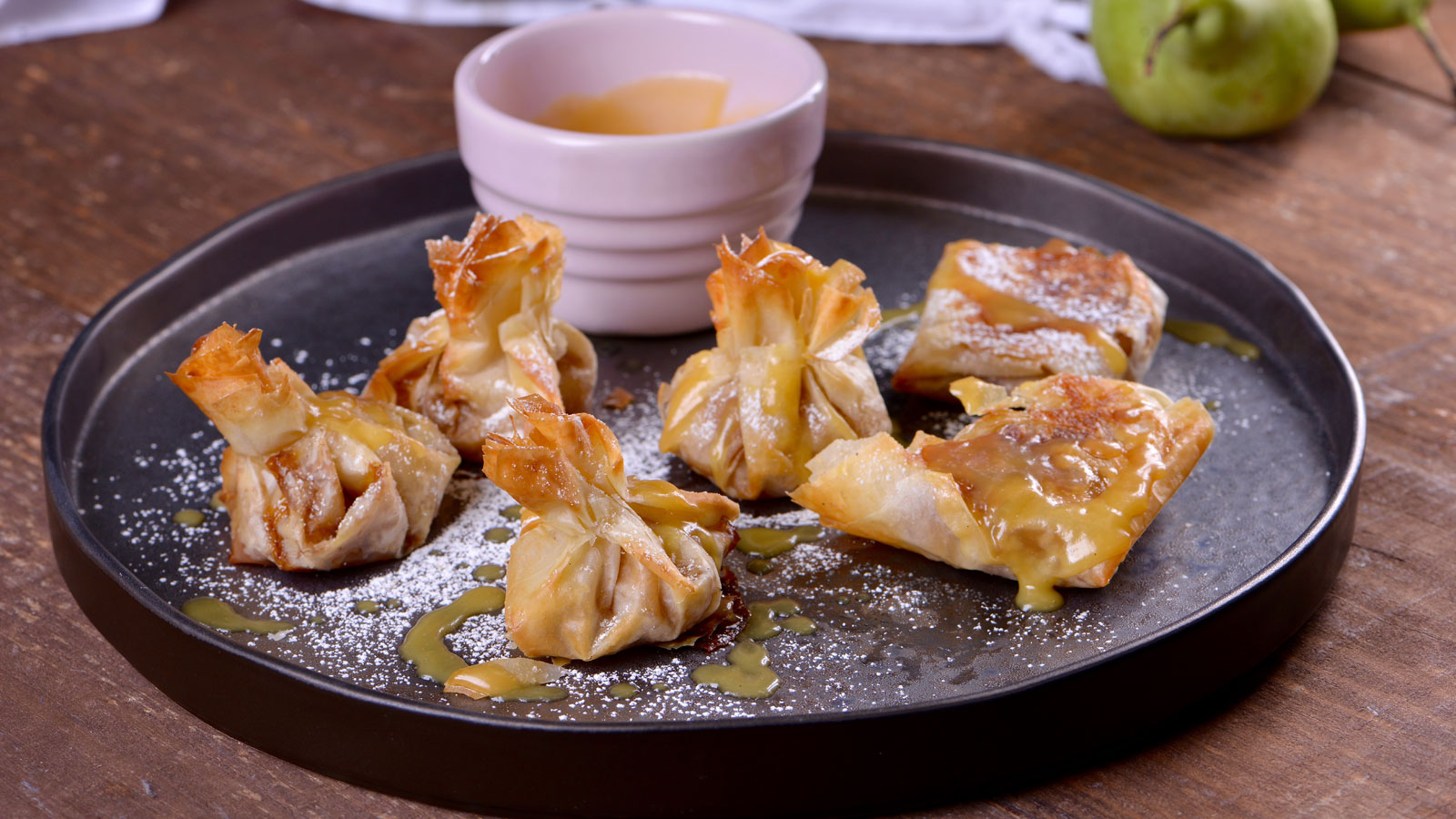 Paquetitos de pasta brick rellenos de pera salteada con salsa toffee