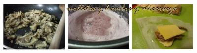 Una vez que ya tenemos las dos partes que compondrán los sobrecillos, tan sólo hay que liar dichos sobres poniendo en cada uno de ellos las setas y una loncha de queso. Cerramos bien cada uno de ellos con la masa Brick (puedes darle la forma que quieras) y vamos reservando.