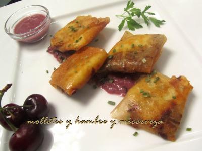Paquetitos de setas y gouda en salsa de cerezas y pimienta rosa