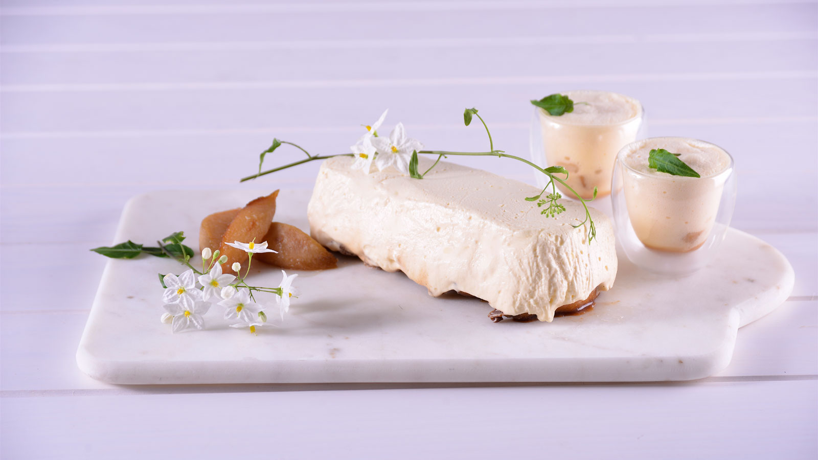 Vertemos esta mezcla sobre un molde de pudding y cubrimos con los gajos de pera dorados.