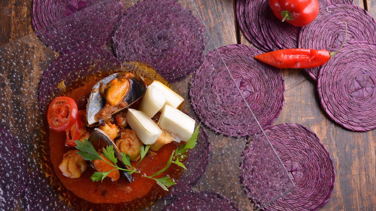 Para finalizar, servimos la parihuela de marisco en un plato hondo. Lo podemos acompañar con yuca cocida y rodajas de ají rocoto.