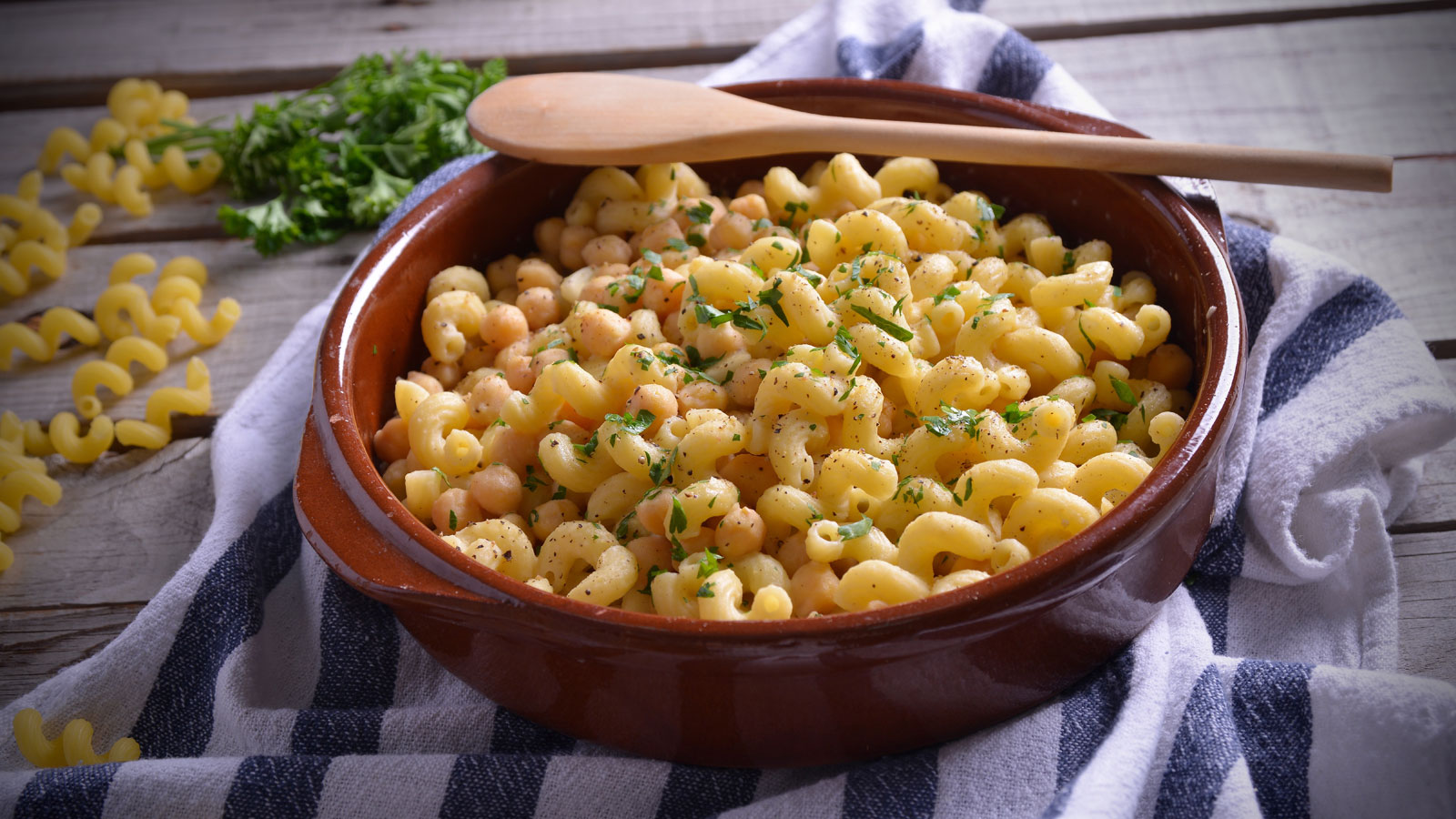 Cuando la pasta esté lista, la retiramos de su olla y la vertemos, todavía al dente, en la cazuela con los garbanzos. Añadimos el romero, el tajini y la pimienta y dejamos cocer unos minutos más.