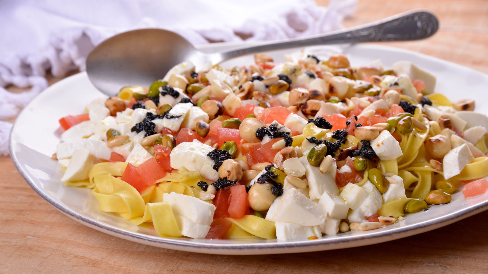 Pasta fresca a la tinta con tomate, nueces y mozzarella