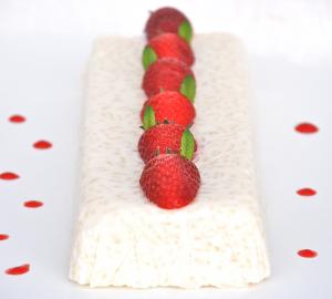 A la hora de presentar, desmoldamos el pastel, cortamos las fresas restantes a la mitad sin quitar el pedúnculo y la colocamos por encima. Con una cuchara dejamos caer gotas de coulis para adornar y el resto de salsa servirla en una salsera aparte. Si tenemos menta a mano, dejar caer unas hojas sobre el plato de presentación.
