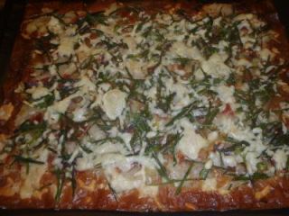 Una vez fuera del horno repartimos por encima la verdura sofrita: los calçots y los espárragos. Encima repartimos el jamón ibérico y por último la mozzarella rallada.