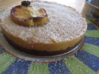 Entonces repartimos el coco por encima y decoramos con la manzana pasada por la plancha, bien dorada, con pelín de aceite y pizquita de sal marina y unas gotas de agua de azahar para aromatizar.