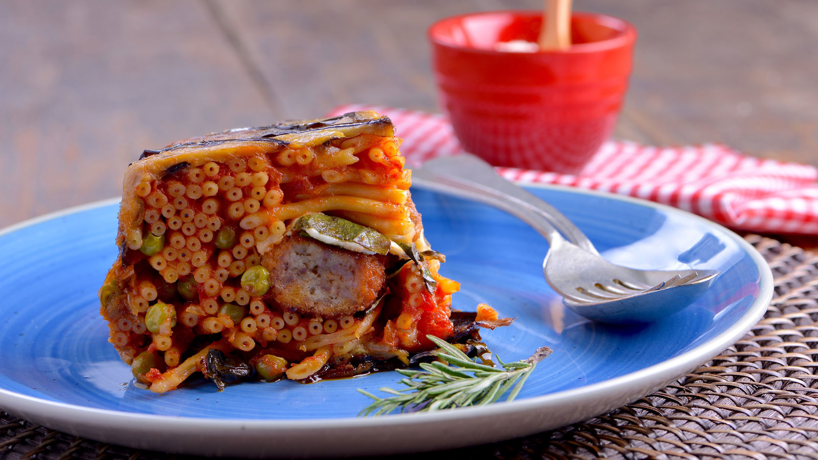 En el capítulo 12 del programa de televisión Cocina italiana con Matteo de Filippo, el cocinero italiano Matteo de Filippo prepara su receta de Pastel de berenjenas (Timballo di melanzane).