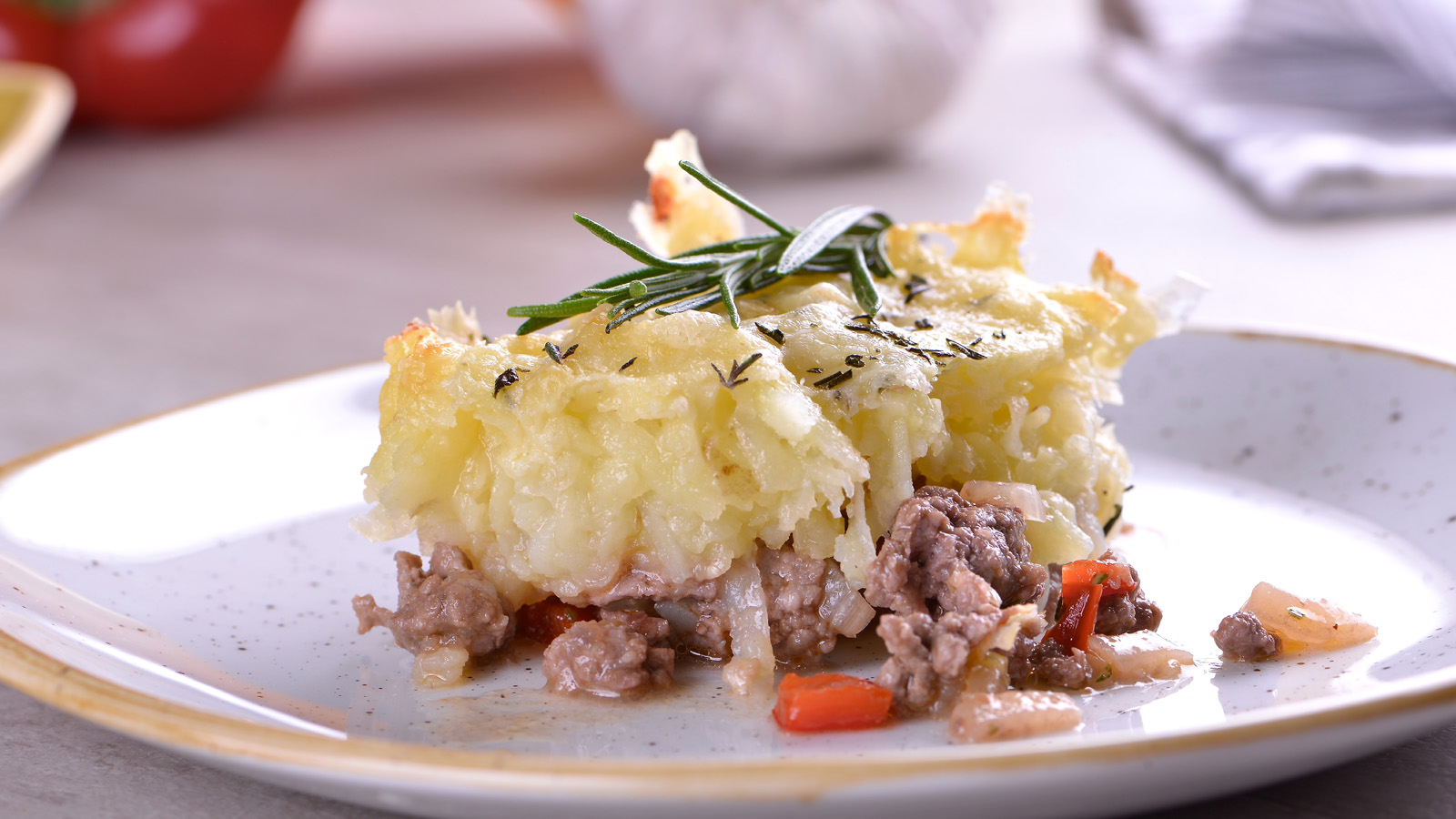 Ponemos este sofrito con la carne en una bandeja de horno y rallamos por encima cheddar y patata con mantequilla.