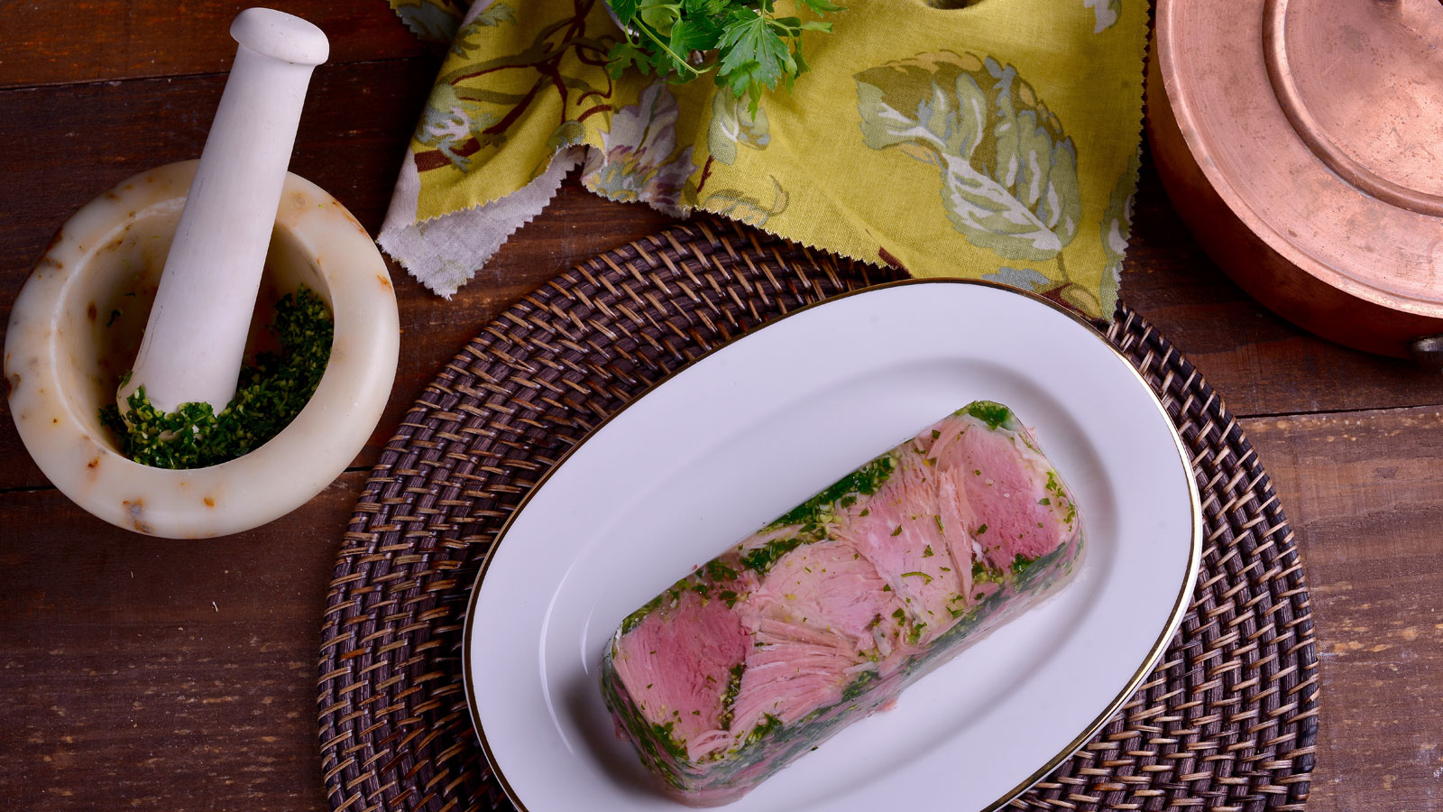 En el capítulo 38 del programa de televisión Cocina Francesa T2, nuestra cocinera Evelyne Ramelet prepara la receta de Pastel de cerdo con perejil y ajo (Jambon persillé de bourgogne). A la hora de elaborar esta receta debemos tener en cuenta que si el lacón viene en salmuera hay que dejarlo a reposo toda la noche en agua fría con vinagre blanco.