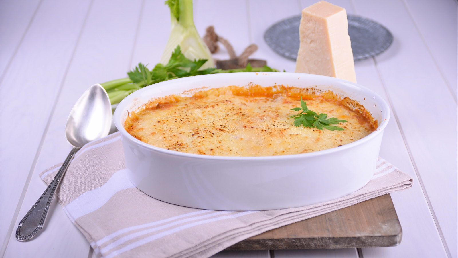 Finalmente, montamos el pastel de papas. En un molde engrasado, ponemos una capa de puré de patata, después todo el relleno de verduras y carne y terminamos con otra capa de puré. Esparcimos bien el puré y añadimos la otra mitad del parmesano rallado.