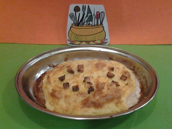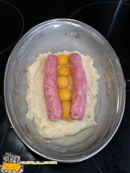 •En unas bandejas individualizadas metalicas, untadas con mantequilla, se pone una capa base de puré de patata, se ponen dos salchichas en el centro y unos huevos de codorniz, sin que se salgan ni la clara ni la yema de la base de puré, para ello podemos hacer un pequeño borde o con las mismas salchichas. Salpimentamos, ponemos orégano y unos trocitos de queso gouda. Lo cubrimos con otra capa de puré, sellándolo todo, ponemos orégano por encima del puré y ponemos dos lonchas de queso y unos trocitos de queso decorando.