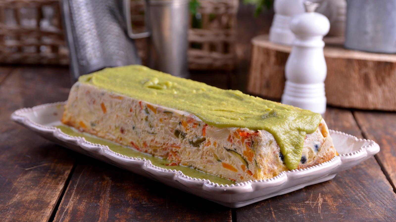 En el capítulo 2 del programa La abuela Lolita la cocinera Dolores Valcárcel nos ensaña a preparar una receta de Pastel de pisto con salsa de guisantes.
