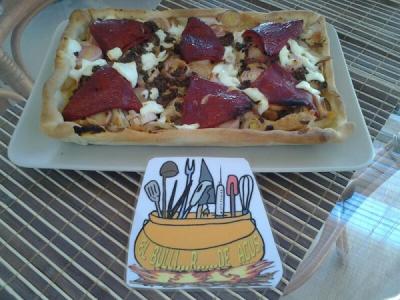 •En el molde de horno, donde tenemos la masa quebrada, forrandolo, pondremos dentro de esta “caja” la mezcla que tenemos reservada dentro del bol, aplanandolo y alisandolo con una cuchara o tenedor y decorando con unos pimientos del piquillo por encima y unas gotas de aceite de oliva.