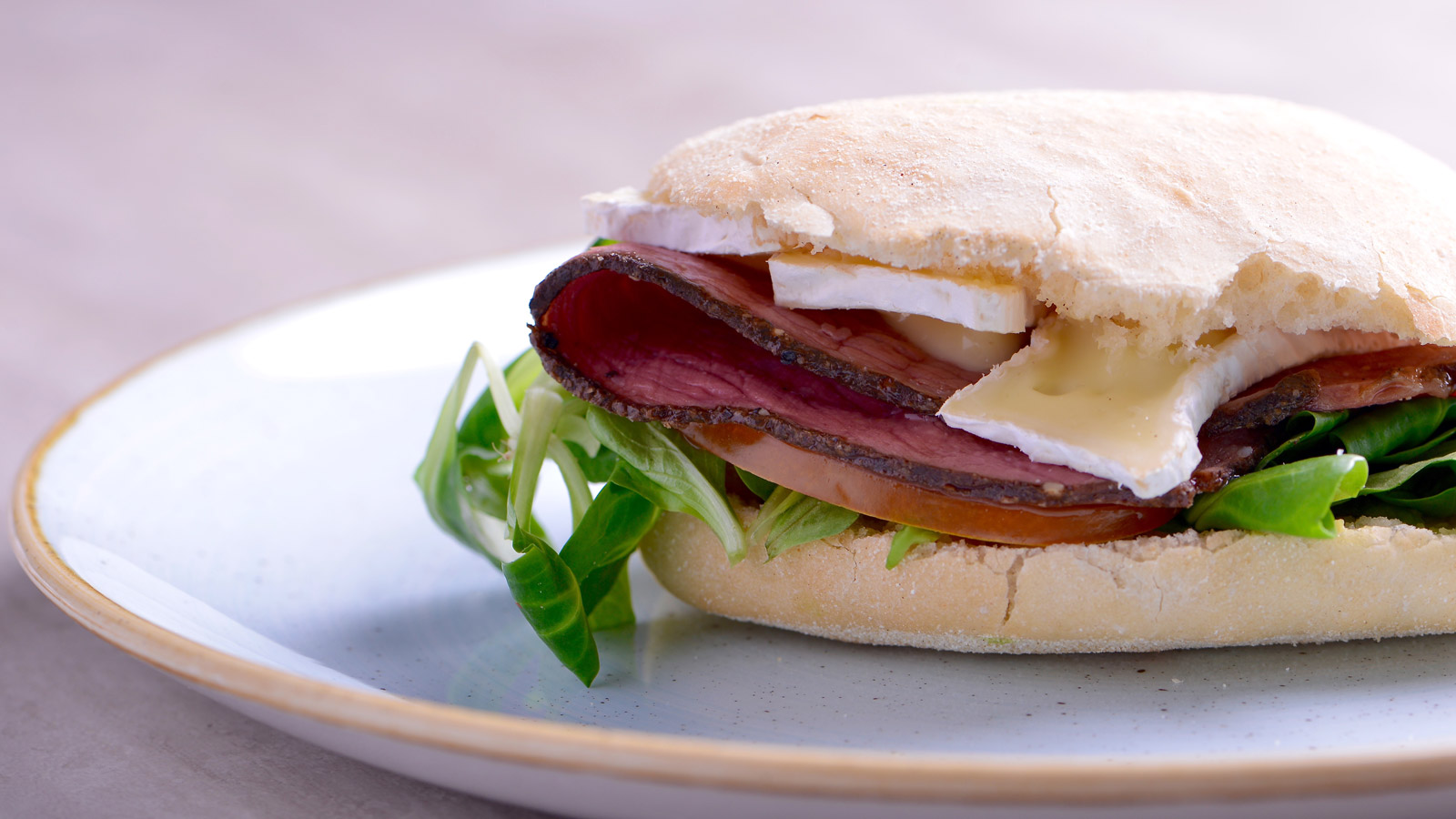 Colocamos una cama de canónigos en la base de nuestro mollete y superponemos 150 g de pastrami en finas lonchas.