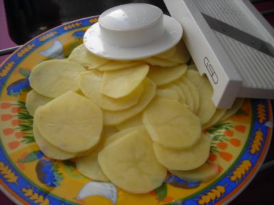 Cortar las patatas en rodajas bastante finas (si se tiene mandolina para cortar, mejor) un poco más gruesas que si fueran para chips, pero no mucho más.