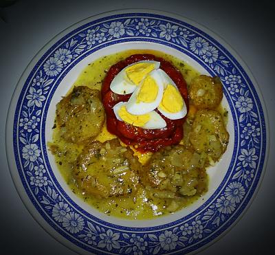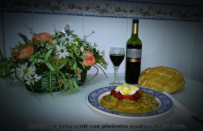 Patatas en salsa verde con pimiento asado y huevo duro