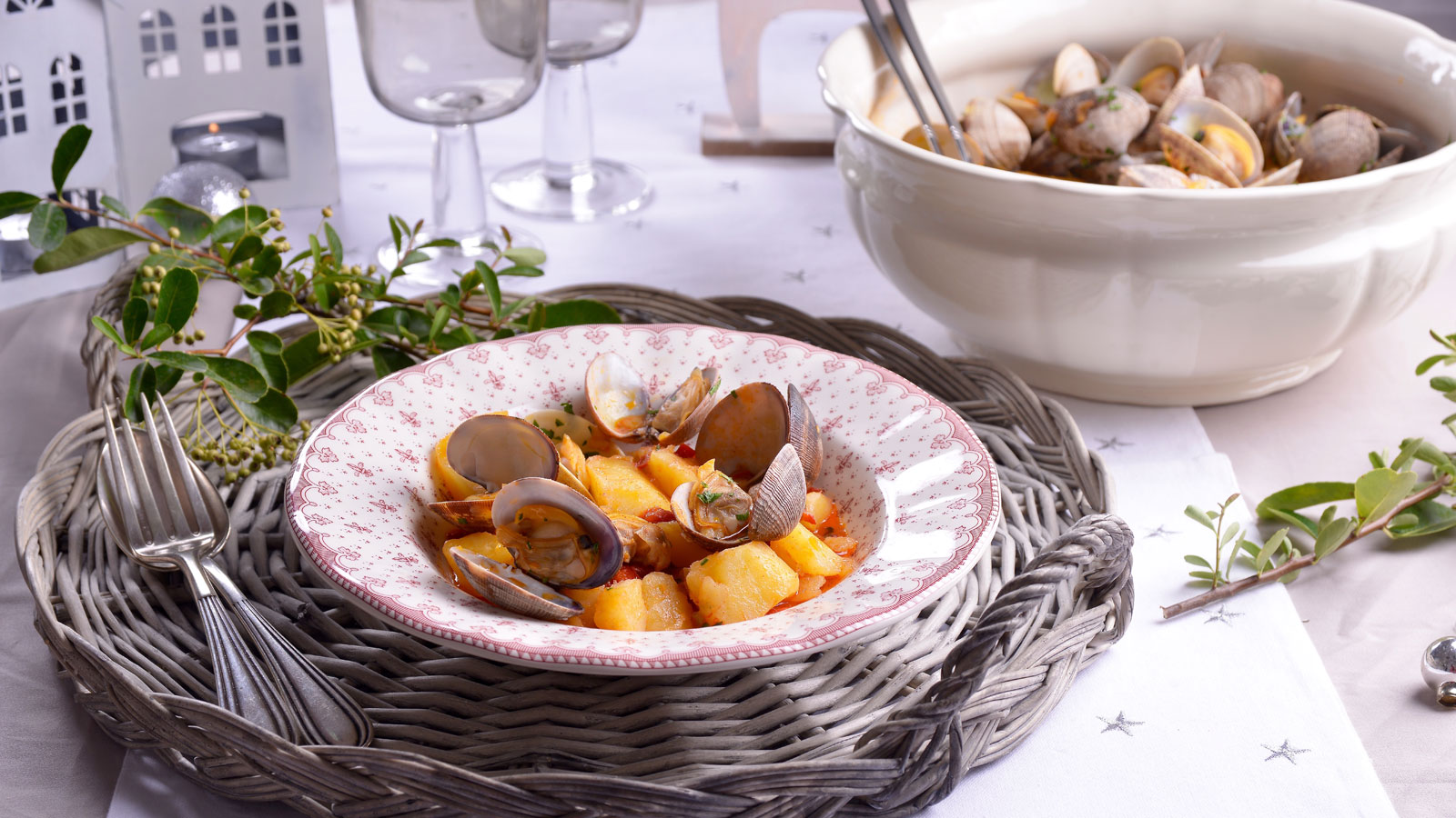 En el capítulo 111 del programa de televisión Cocina de familia T6, nuestra cocinera Elena Aymerich prepara una receta de Patatas guisadas con almejas. Nuevas ideas de Elena Aymerich para celebrar las fiestas navideñas.