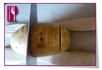 Ahora toca cortarlas, este proceso es fundamental, ya que dependerá de como queden las patatas al final. Coloca cada patata entre dos cucharas de madera y haz unos cortes con una separación de 1 a 1,5 cm, pero ten cuidado en las puntas cuando cortes.