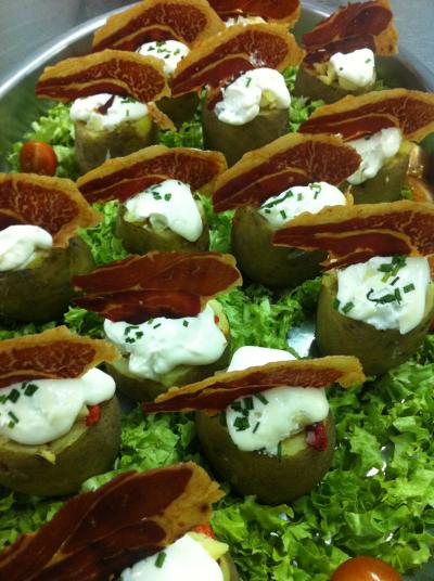 Se lavan las patatas, y se cuezen en una olla con agua 1 hora, una vez frías, se corta la parte de arriba y con ayuda de una cuchara se vacían,la merma se trocea y se reserva,se cortan los espárragos el pimiento,se saltea y se le añade el tomate rallado y la patata que abiamos reservado, se sofríe todo y se sal pimienta , una vez Frio se rellenan las patatas y se napan con la mahonesa y el alioli que abremos mezclado anteriormente, el jamón se extiende en latas de horno entre dos papeles poniendo peso encima y se hornea a 140 grados hasta que dore y se deja enfriar, se coloca un crujiente de jamón encima de cada patata y cebollino picadito, se corta la lechuga y se dispone en una bandeja y encima las patatas
