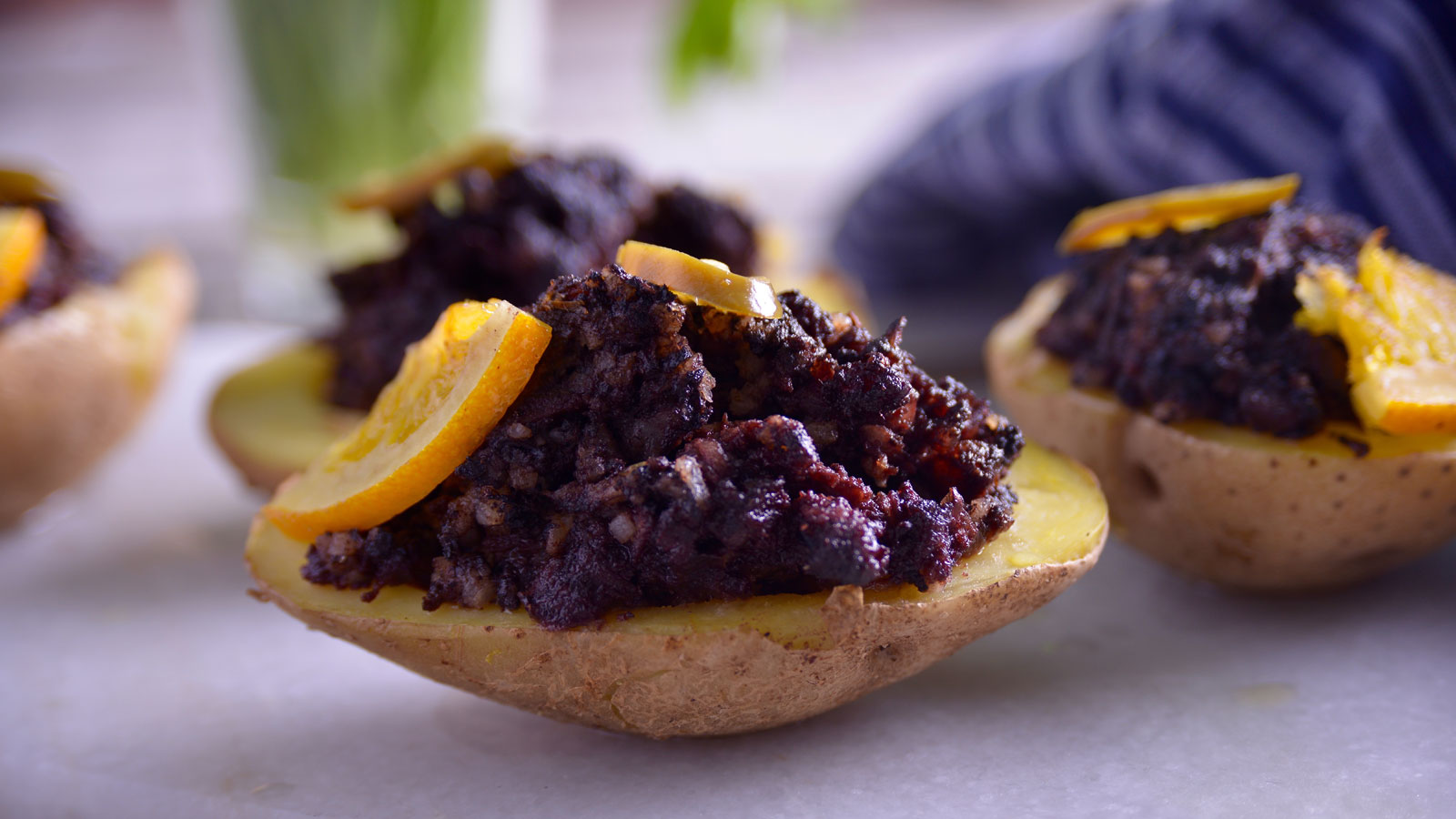 Patatas rellenas de morcilla con naranja confitada y jalapeños