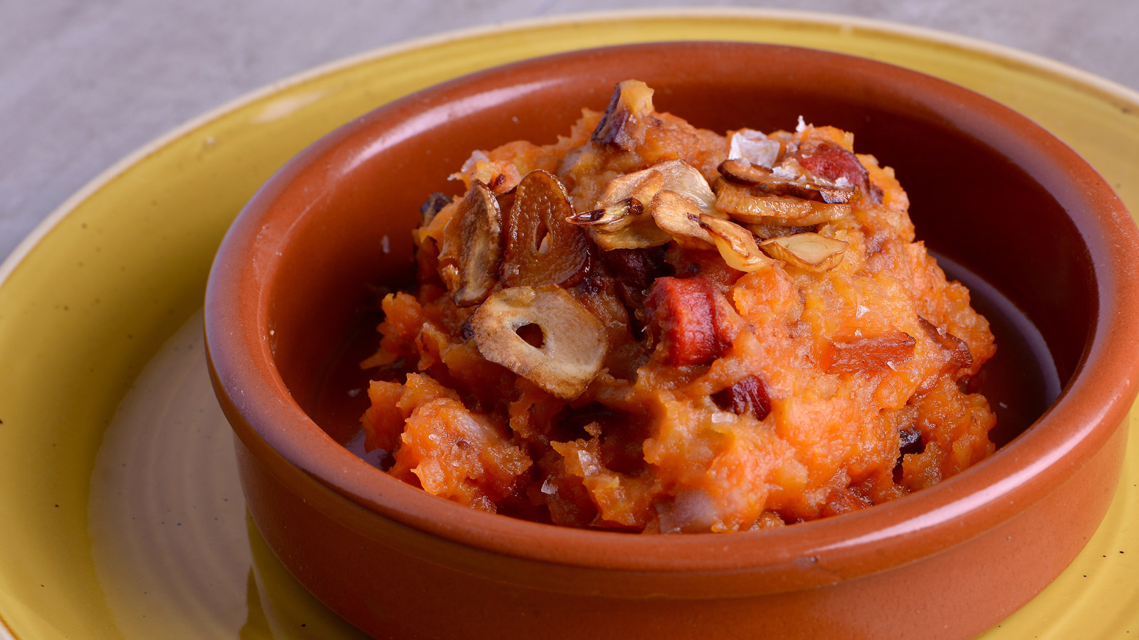 Por último, mezclamos y aplastamos bien las patatas con el resto de ingredientes y colocamos el ajo laminado frito por encima para servir.