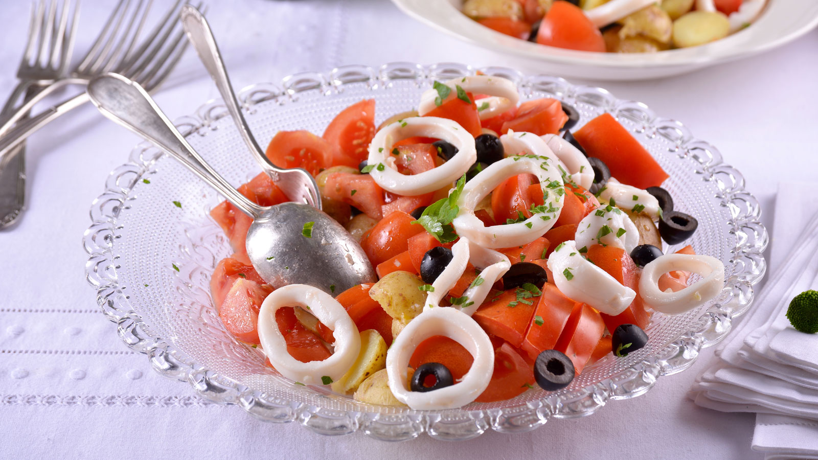 Emplatamos cubriendo el fondo de una ensaladera con un lecho de patatas. Continuamos distribuyendo los cuartos de tomate, los calamares y las aceitunas negras.