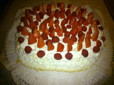 ENCIMA DEL MERENGUE PONEMOS LA NATA, LAS FRESAS Y FRAMBUESAS. Y A COMERLA.......